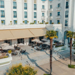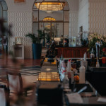 - Un espace bar dans le hall majestueux de l’hôtel, sublimé par ses silhouettes dorées et ses verres stylisés.